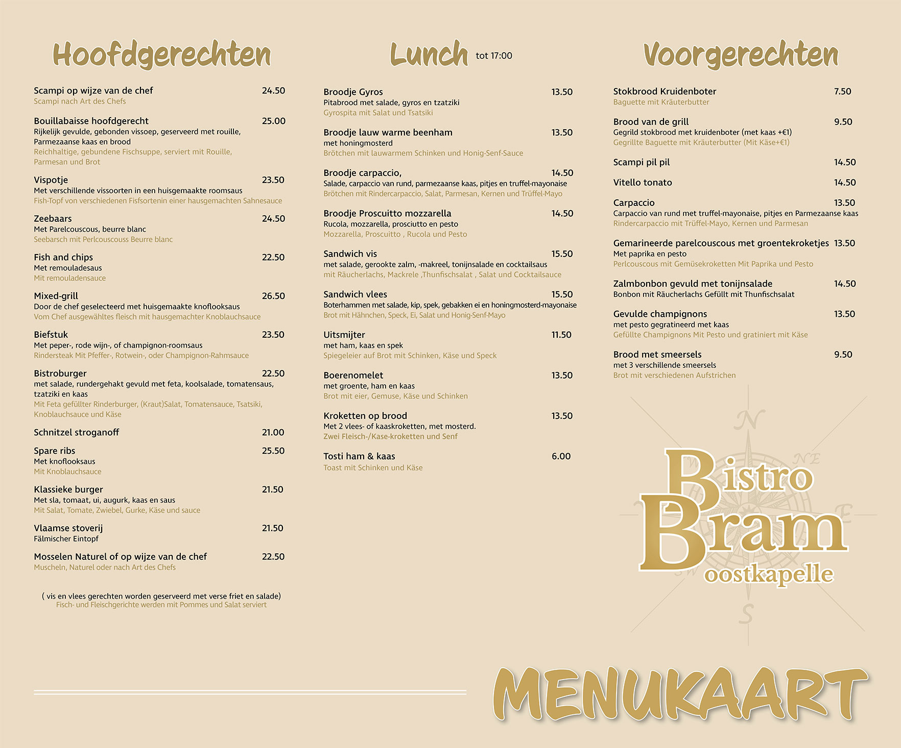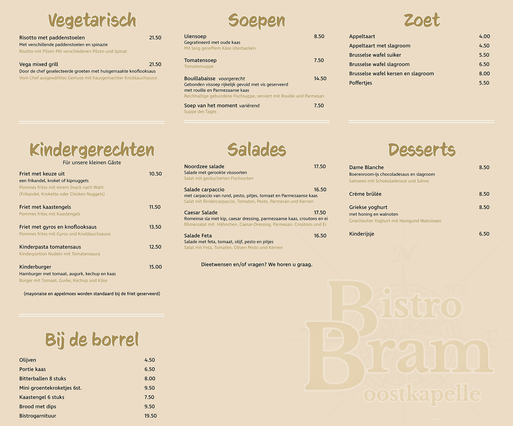Welkom bijBistro Bram Oostkapelle Een gezellige avond uit,met mooie gerechten,in een goede sfeer. Take Away bij Bistro Bram LET OP! reserveringen doen wij alleen telefonisch Web Site Heeft u vragen? Voornaam * Achternaam * E-mailadres * Opmerkingen / Vragen * Verstuur bericht
